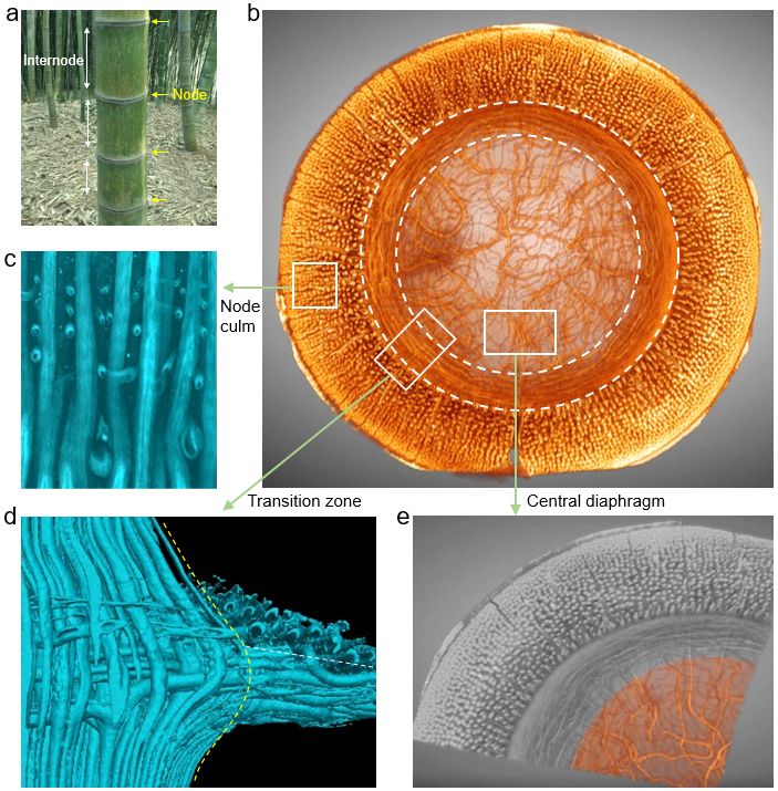 毛竹凭借较轻的重量、卓越的机械性能和迅速的生长等优势,逐渐成为替代木材和化学合成品的一种可持续资源。与具有纤维单向排布结构的竹间相比,短小的竹节似乎机械性能较为薄弱,其在工程纤维层合板加工中往往被废弃。在高大笔直的毛竹的生存发展进程中,占比不大的竹节将发挥定点机械支撑强化和流体多向输运等方面作用。这种双功能或多功能的实现必然与竹节内部结构紧密相关,然而目前有关竹节的空间纤维构造和构效关系仍然模糊不清。