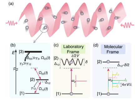 图1:NFR机制原理示意图。(a)运动的分子与驻波相互作用吸收谱的示意图;(b)分子的能级结构示意图;(c)-(d)分别为实验室坐标系下与分子坐标系下的简化能级结构示意图。