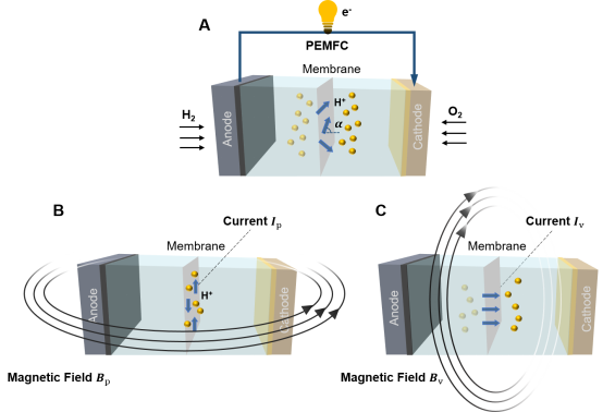 在PEMFC运行过程中,电池性能状态与其内部水分布、电流分布息息相关。目前,相关技术主要通过材料分析、水传输分布、电流分布等手段来评估氢燃料电池性能状态。然而这些技术会干扰电池的运行状态,甚至破坏电池固有结构和性能,进而很难保证技术可靠性和实用性。PEMFC电流分布和相应磁场分布如图1所示,作者将PEMFC内部电流分解为平行膜方向膜电流(图1B)和垂直膜方向主电流(图1C),并揭示了氢燃料电池故障时性能下降的本质原因是参与化学反应的主电流减少,寄生损耗的膜电流增加,因此膜电流及其激发磁场可以反映电池性能变化。这是在该研究领域内首次系统性分析并提出了氢燃料电池的性能变化与其内部不同分量电流和激发磁场的关联机制。