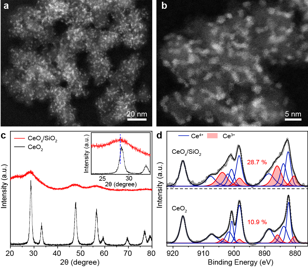 图2.负载在氧化硅上的氧化铈“纳米岛”的结构表征。