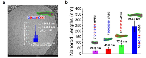 图2. 不同序列的精准编码两亲性聚合物自组装成长度可控的数码胶束。