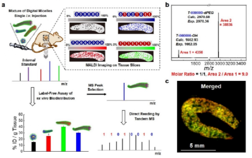 基于精准编码两亲性聚合物的合成、测序,以及数码胶束的成功构建,研究人员进一步探究了数码胶束在生物体系中精准定量的可能性。首先研究人员通过对照实验证明了聚合物合理的分子量设计可规避生物(大)分子对MALDI质谱测试的干扰。随后将四种典型的数码胶束 (一种球状胶束和三个不同长度的棒状胶束)等量混合,通过尾静脉注入大鼠体内,在不同的时间点取出主要器官,并对器官进行研磨、冻干和萃取操作。基于此,研究人员以无标记定量的方式系统研究了不同数码胶束在大鼠器官中的生物分布。此外,由于PEG dendron对精准编码两亲性聚合物MALDI检测灵敏的增强作用,研究人员进一步对组织切片 (如脾脏切片) 进行MALDI成像,并揭示了数码胶束在器官中的空间分布 (图3)。