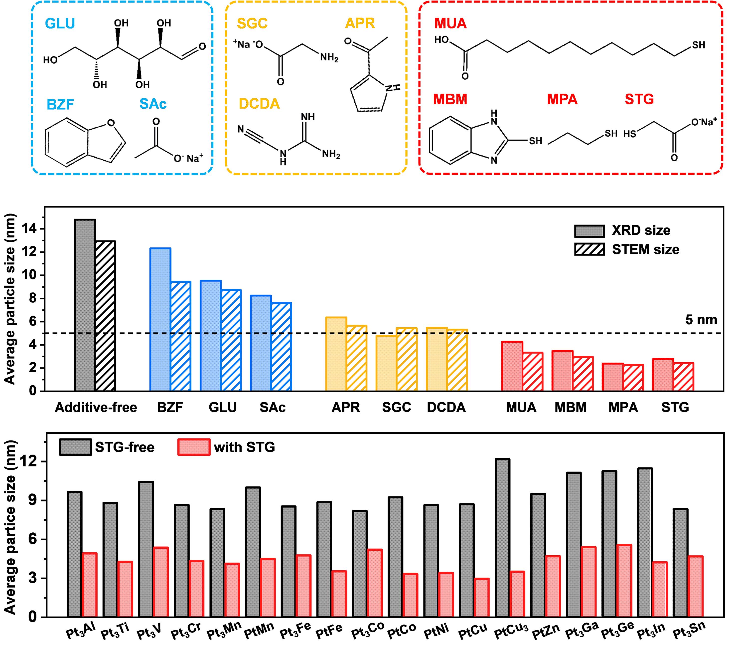 在该项工作中,研究人员发展了一种小分子辅助合成小尺寸Pt-IMC催化剂的策略,将含杂原子(O、N、S)官能团的小分子作为浸渍过程中的添加剂,相比于直接浸渍法,具有明显的抑制颗粒烧结的效果。特别地,使用含巯基的小分子如巯基乙酸钠时,经过700℃退火,X射线衍射测试结果表明,合成的PtCo颗粒的平均粒径仅为2.5 nm,远小于不加小分子的14.9 nm的颗粒尺寸(图1)。此外,含有O和N杂原子的小分子添加剂也有一定抑制催化剂高温烧结的效果。
