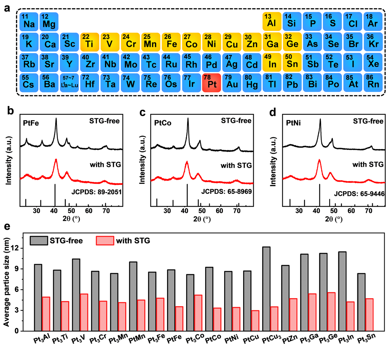 研究人员将巯基乙酸钠作为最优选择,通过优化退火的温度以及时间,合成了包含18种二元Pt-IMC催化剂的材料库,均具有较小的的平均颗粒尺寸(图2)。对合成的Pt-IMC进行了系列表征:高角环形暗场透射电镜结果显示Pt-IMC颗粒均匀分布在碳载体上,且颗粒尺寸均匀;X射线能谱结果表明Pt与第二种过渡金属均匀分散在颗粒区域,且含量接近目标比例;原子分辩的透射电镜照片表明颗粒内部的原子呈现有序规则排列。