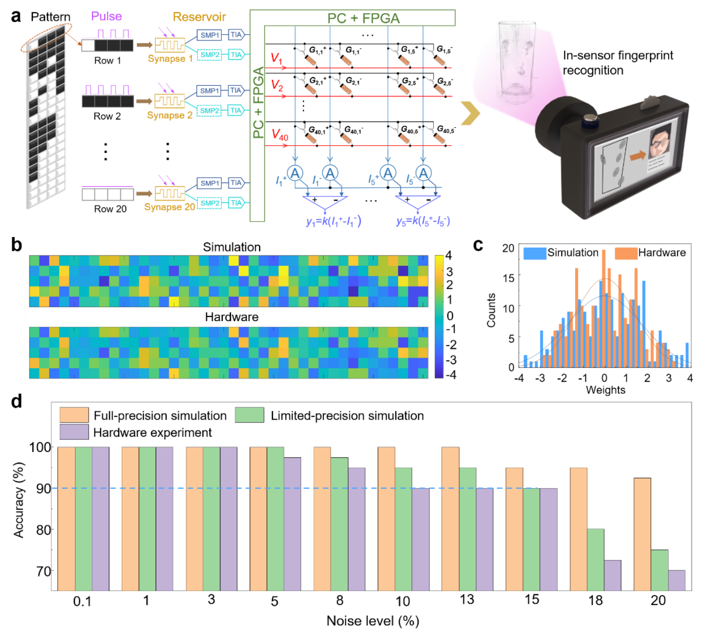 团队基于富镓氧化镓材料设计,利用非晶材料的显著持续光电导效应,制备了具备短时程效应的光突触器件。通过4比特的紫外光脉冲输入测试,构建了感算器件RC网络的映射关系,这可以将图片信息通过紫外光转化为特征电流值(图2a)。最终,通过存算忆阻器阵列稳定的多态调控特性实现了对储备池输出的训练,实现了小规模的深紫外指纹识别功能。基于该硬件系统,采用定制化特征值策略,DUV指纹图像的高识别精度几乎与软件仿真结果相匹配(图2b,c)。该系统在短期训练后即可达到100%的识别准确率,并且即使在15%背景噪声水平下也能保持90%的准确率,这与DUV波段的抗噪特性相符(图2d)。这种全硬件感算RC系统为高效的识别和安全应用提供了很好的参考原型,也对深紫外波段的智能光电器件发展具有重要参考意义。