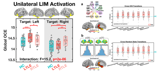 图2 通过网络控制理论模拟大脑动态进程,发现颞叶癫痫患者在整体和局部均存在能效的降低,相比健康对照需要更高的控制能量来实现相同的大脑状态转化