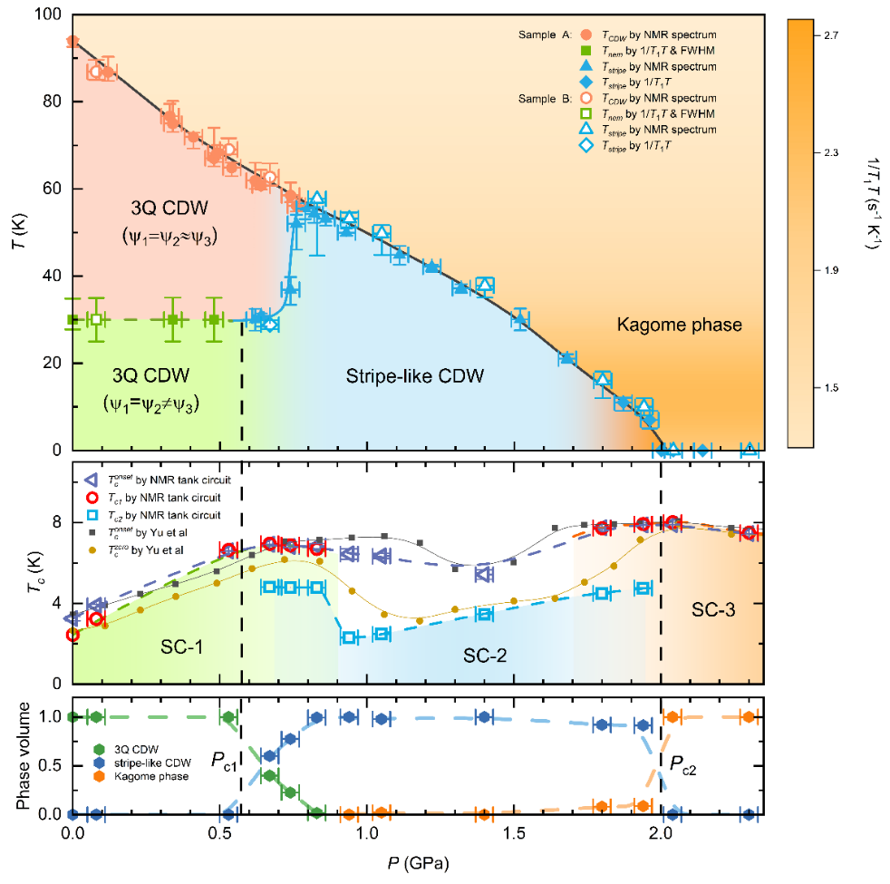 近日,中国科学技术大学合肥微尺度物质科学国家研究中心、物理学院、中科院强耦合量子材料物理重点实验室陈仙辉院士团队吴涛教授等人在笼目超导体(kagomesuperconductor)的竞争电子序研究中取得重要发现。利用高压下的核磁共振技术,研究团队在笼目超导体CsV3Sb5中观察到一种由压力诱导的电荷有序态,并发现该电荷有序态与超导态之间存在强烈的相互竞争。这一发现不但为理解笼目超导体中复杂的演生物理现象提供了重要的实验依据,也为进一步在笼目超导体中探索新奇超导态提供了新的方向。相关研究成果于11月24日以 “Emergent charge order in pressurized kagome superconductor CsV3Sb5”为题在Nature杂志上发表[https://www.nature.com/articles/s41586-022-05351-3]。