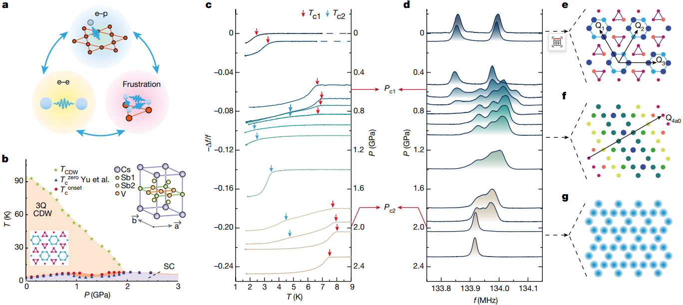 图1:笼目超导体CsV3Sb5中电荷密度波态与超导态在静水压下演化的实验证据以及物理演示图。