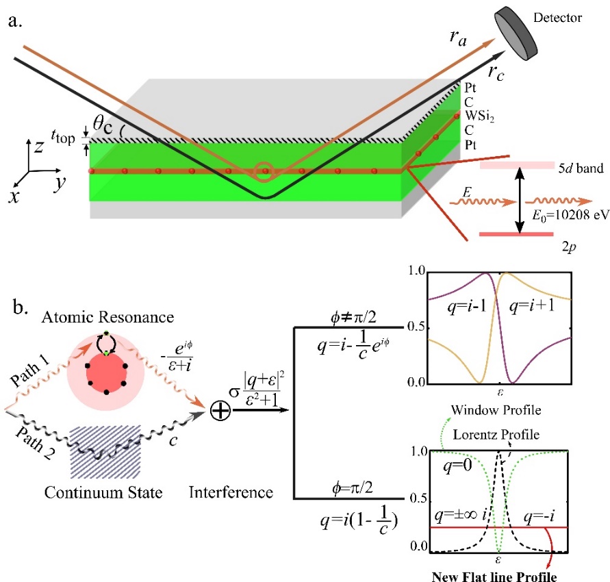 朱林繁教授课题组利用X射线薄膜平面腔,选用W原子2p→5d跃迁作为分立通道,与腔本身反射的连续通道发生Fano干涉。调节X射线的掠入射角度至一阶模,并改变薄膜腔的顶层Pt厚度,实现了纯虚数q因子的大范围调控,其基本原理见图1。实验中,在顶层Pt厚度1nm时,q因子取-i,此时干涉交叉项精确抵消共振分立项,从而抹除了原子共振跃迁散射信号,在反射方向上只能探测到随能量不变的连续谱,并理论模拟重现了实验观测,见图2。通过薄膜平面腔“隐身”特定原子内壳层跃迁,为实验上探测吸收边前弱结构提供了新思路。