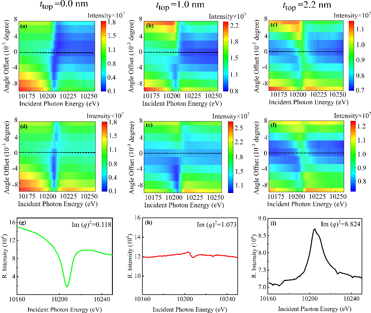 图2.(a-c)不同腔结构下的实验反射谱,虚线对应模式角度位置;(d-f)扣除吸收边影响后提取的实验反射谱。(g-i)模式角度下扣除吸收边影响后的实验反射谱。图(h)清楚展示了直线型的Fano线形