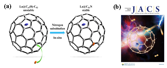图注.(a)氮原子(橙色)取代La@C3v(8)-C82(左)碳笼上碳原子原位形成单金属内嵌氮杂富勒烯La@C81N(右)示意图。(b) JACS外封面图,形象地表示了在电弧放电条件下,氮气分子的氮氮三键被破坏,裂解为两个氮原子。随后高能的氮原子(橙色)进攻碳笼,将碳笼上的一个碳原子(灰色)取代后留在碳笼骨架上,形成氮杂富勒烯。