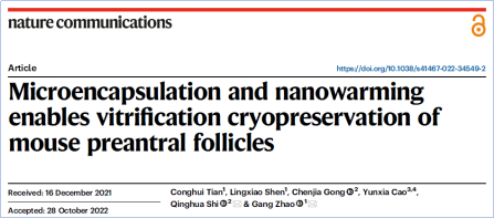 相关研究成果以“Microencapsulation and nano-warming enables vitrification cryopreservation of mouse preantral follicles”为题发表于国际期刊《Nature Communications》。该结果对基于卵泡的女性生育力保存具有重要的参考价值。