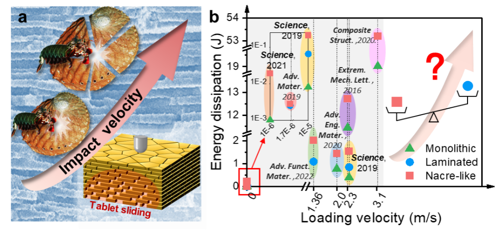 珍珠层是自然材料中最具有代表性的结构仿生模型之一,通过“砖块-灰泥”结构相关的内在变形机制可以将能量耗散提升几个数量级。现有研究已充分展现出仿贝壳结构在部分低冲击速度下,作为防护材料抗冲击设计模板的优越性。但在自然环境下,贝壳会经常被捕食者以一定的冲击速度击碎,不清楚仿贝壳结构在更大范围的速度加载下是否仍然具有显著的抗冲击性能。