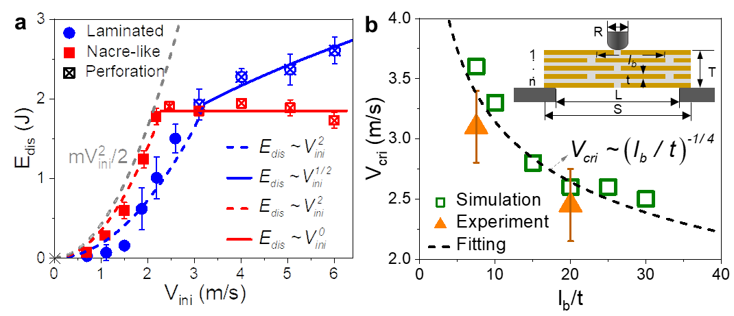 图3 冲击速度影响抗冲击性能的机制分析:(a)结构耗能随冲击速度变化的标度律 (b)仿贝壳结构砖块纵横比影响