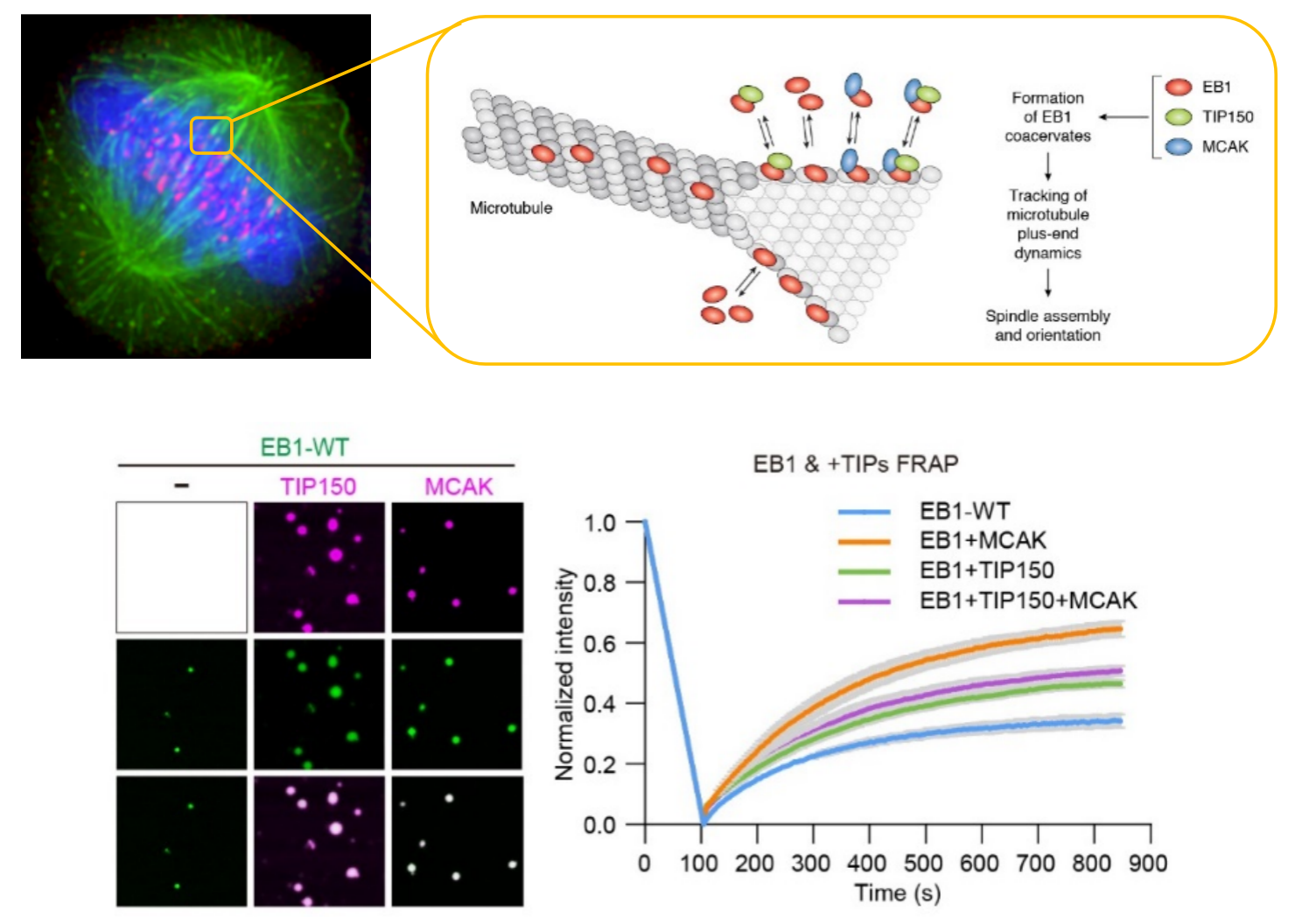 随着结构照明成像技术的发展,研究人员发现了EB1蛋白在活细胞动态微管追踪过程的液滴表征,利用基因编辑、物理化学模拟碱性氨基酸的丰度与间隔,并结合超高分辨成像,揭示了EB1蛋白的相分离特征与凝聚态物质基础,解析了相分离驱动EB1蛋白的微管正端追踪功能。至此,联合团队阐明了EB1蛋白相分离调控纺锤体微管可塑性的物理化学机制,向解析生物大分子凝聚态调控细胞命运可塑性理论研究迈出了重要一步。此外,杂志同期发表了瑞士保罗谢尔研究所和苏黎世联邦理工学院以及荷兰代尔夫特理工大学的两篇合作论文,他们利用低等真核细胞酵母,证明了EB1酵母同源蛋白的相分离特征。