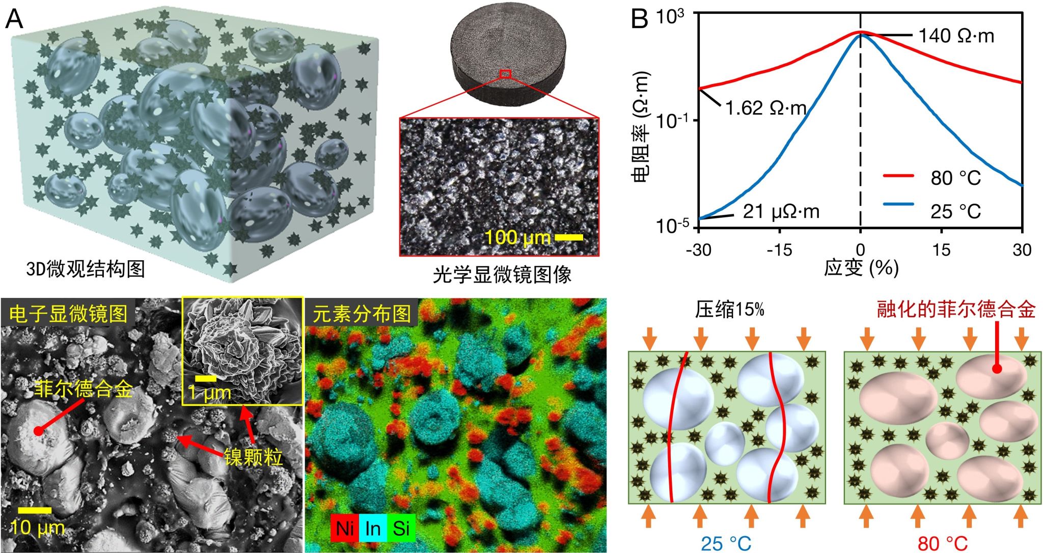 为填补这一研究空缺,联合研究组开发了一种由镍微米颗粒、低熔点菲尔德合金(FM)和聚合物基体组成的复合导电弹性体(FMHE)。归功于不规则镍颗粒和FM颗粒形成的多填料导电网络(图1A),这种材料的电导率可在包括压缩、拉伸、扭转、弯曲在内的机械载荷下指数增强超过一千万倍。当材料被加热至60℃以上时,其中的FM颗粒融化。熔化的FM液滴不能像固体FM颗粒一样互相接触以形成导电路径,而是在载荷下随聚合物基质变形。这显著降低了材料的弹性模量,导电性和应变灵敏度 (图1B)。由于材料在变形时电阻显著降低,由3V电压供电的复合材料可以在特定压力下被加热以融化FM颗粒,从而实现刚度和电阻的自触发协调增效调节。
