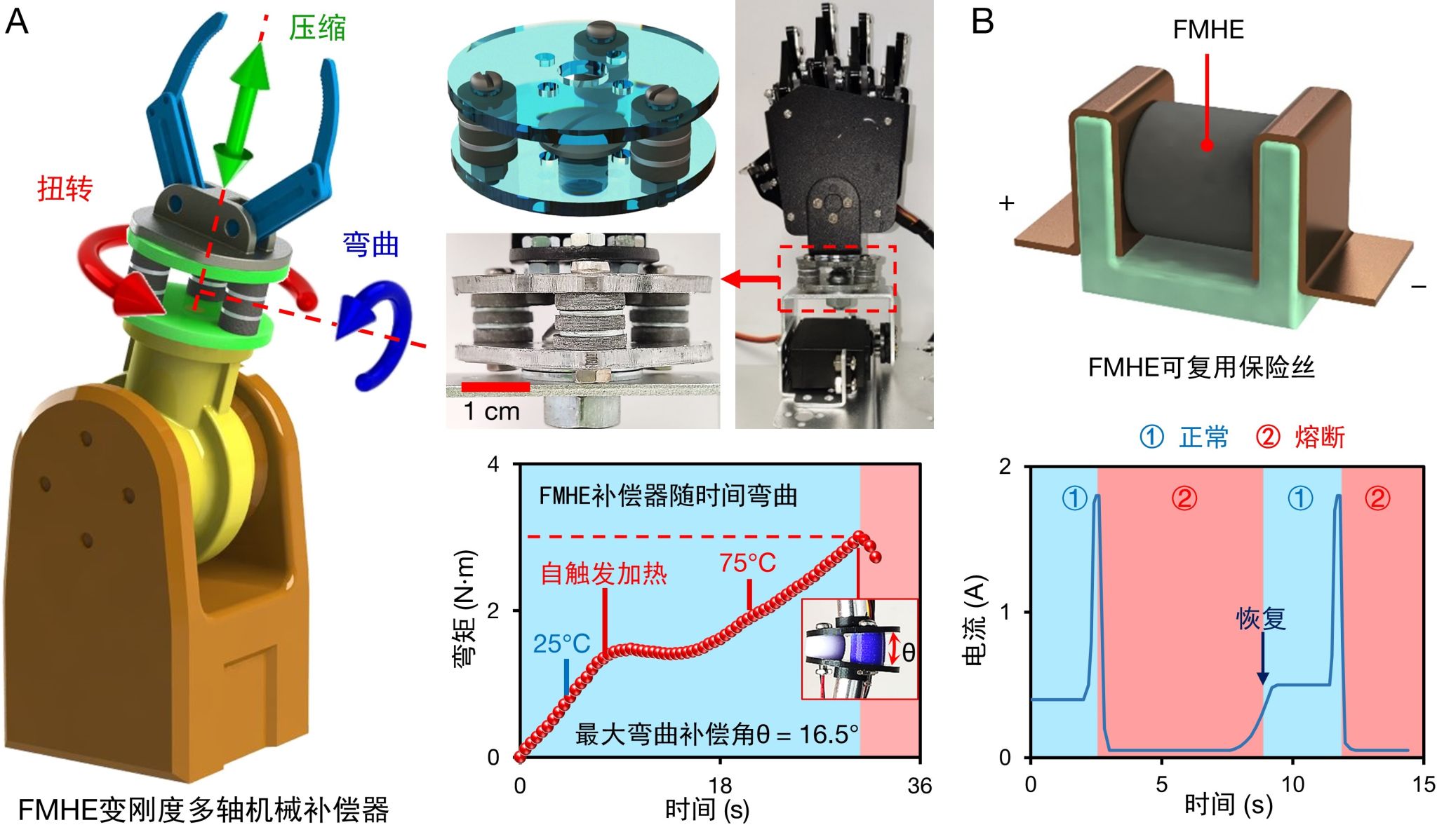 图2 基于FMHE开发的(A)变刚度补偿器和(B)可复用保险丝