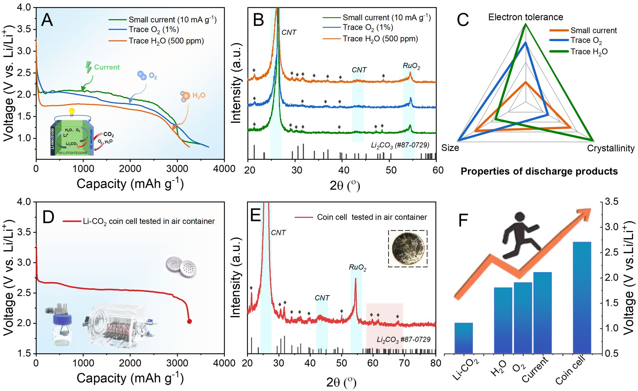 为寻找高电压的来源,研究团队进一步探究了解耦空气组分和工作条件对电池性能的影响。1% O2和500 ppm H2O将电压平台提升至1.8~2.0 V,放电产物中并没有检测到LiOH,Li2O2等副产物。然而,所产生Li2CO3的形貌和结晶度却有明显差异。O2和H2O通过改变Li2CO3的生成路径降低能量势垒,并且有效缓解电极钝化,从而加快反应速率,提升放电电压平台。基于解耦分析,测试装置中轻微的空气残留或者泄露可能导致更高的电压平台,且极难以察觉。随后,研究团队通过模拟先前报道中静态封存CO2的测试方法,成功复刻出了~2.6 V电压平台,锂源产物仍然为单一的Li2CO3。