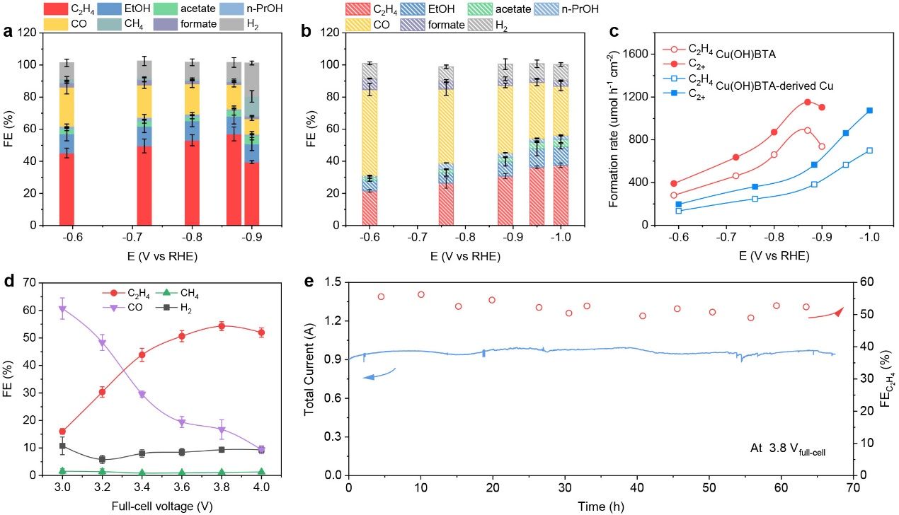 流动池中二氧化碳电还原性能显示,苯并三氮唑铜在-0.87伏特 (相对于可逆氢电极),总电流-500毫安每平方厘米的条件下,其多碳产物的法拉第效率达到73%,其中乙烯产物的法拉第效率达到57%,是金属铜催化剂性能的1.3和1.5倍。膜电极反应池性能评估进一步表明,苯并三氮唑铜在近1安培的工业级电流下,全电池稳定电解二氧化碳还原制乙烯长达67小时,展现出苯并三氮唑铜优异的二氧化碳电催化性能(图2)。