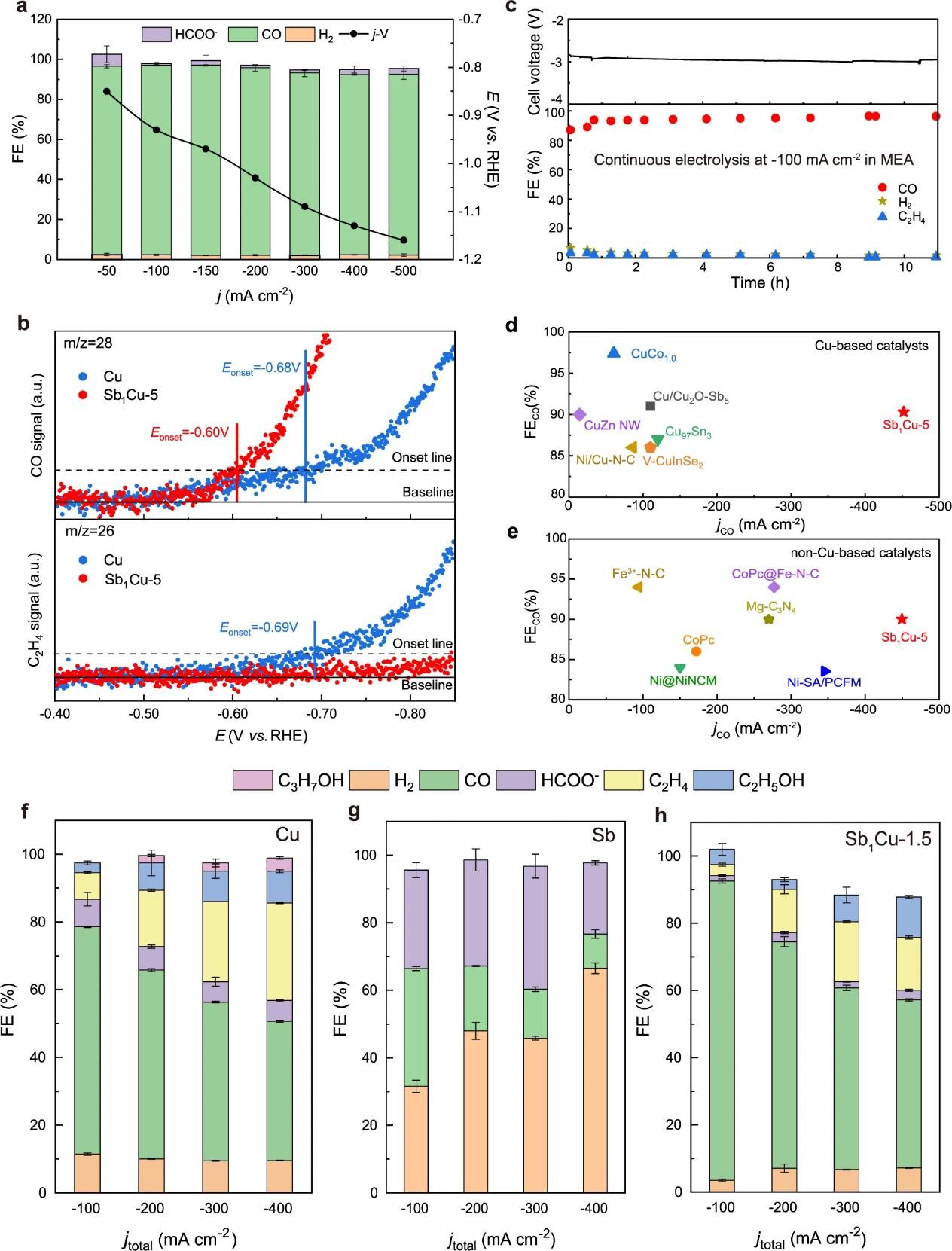 图4. Sb1Cu单原子合金催化剂的二氧化碳还原性能