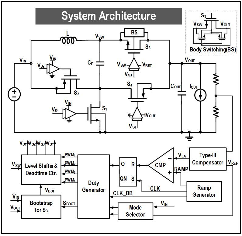 现有的Buck-Boost转换器通过引入飞电容减少功率路径上的功率管数量来降低导通损耗,但同时也导致了功率管的耐压问题,限制了效率的提升;为了克服耐压问题,一些工作又引入更多的功率管和飞电容,增加了成本并且降低了芯片的电流密度。随着移动电子设备集成的功能越来越多,负载电流越来越大,现有Buck-Boost结构在效率与电流密度之间的折中愈发挑战。