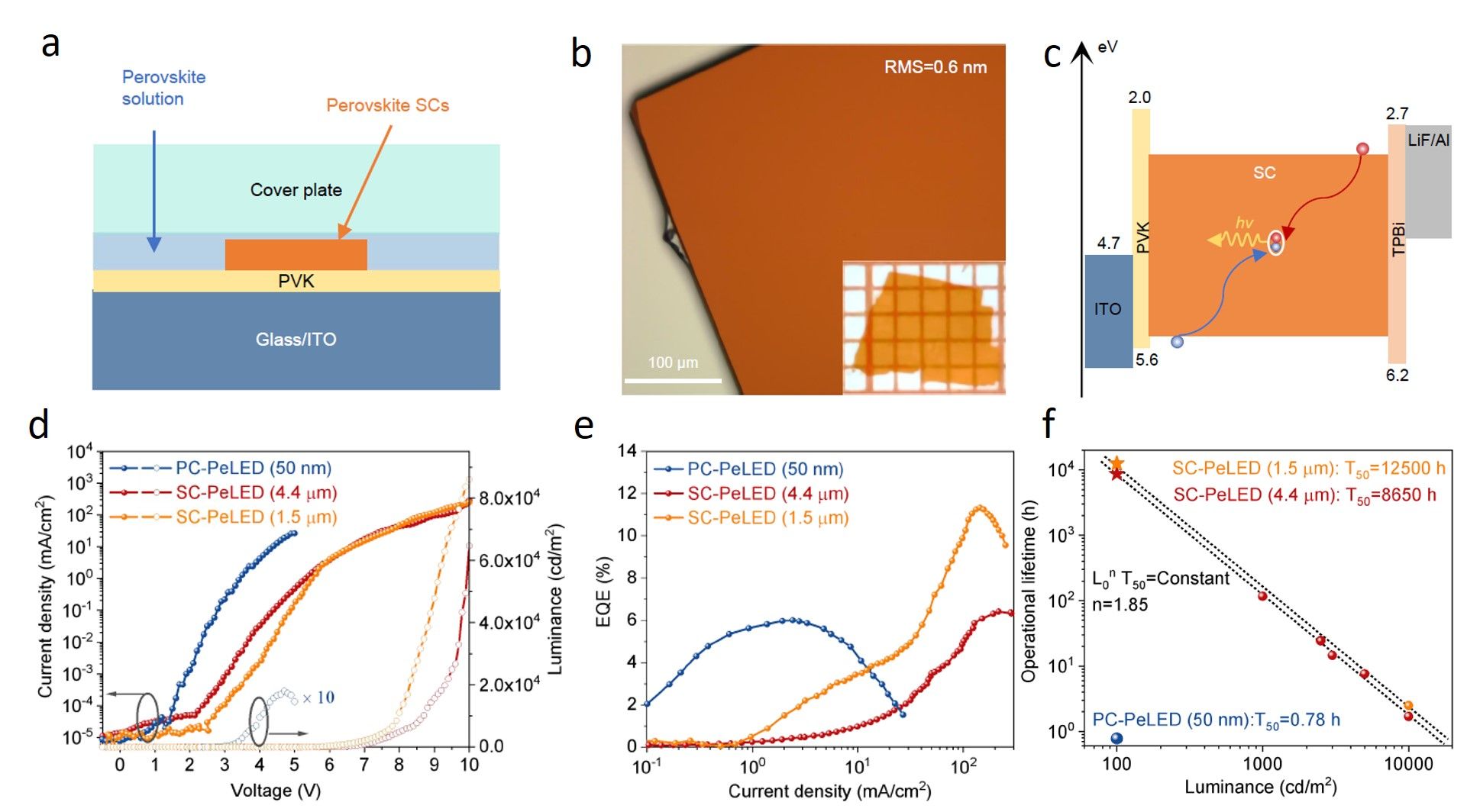 图示:空间限制法生长单晶示意图(a),单晶的显微镜图(b),钙钛矿单晶LED的器件结构(c),钙钛矿单晶LED性能表征(d-f)。
