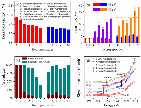 图1(a)烷基过氧化物的电离能,(b)总的光电离截面,(c)光解离通道占比,(d)OOH脱去路径的出现势