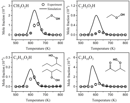 基于烷基过氧化物和羰基过氧化物光电离截面的实验测量,本工作实现了戊烷低温燃烧生成的甲基过氧化氢、乙基过氧化氢、戊基过氧化氢和羰基过氧化氢的准确定量分析(误差±32%)。实验数据与国际上广泛使用、经详细验证的烷烃低温燃烧动力学模型的模拟结果对比发现,模型过早预测了这些链分支中间体的生成温度(25-50 K),并过高的预测了它们的生成量(2-7倍),表明现有的低温燃烧动力学模型需要进一步的验证和优化(图2)。