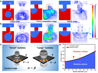 谈鹏团队将“气泡二极管”的概念应用于二次锌空气电池中,以实现快充过程气体的及时输运。数值计算结果表明,大尺寸气泡需要更高的接触角差使正反面产生足够的不平衡表面张力驱动其穿过电极。据此绘制了气泡和接触角大小相关的气泡行为相图,用于指导电极设计。