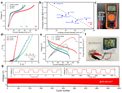 以膨体聚四氟乙烯(ePTFE)膜基体为研究对象,基于原位观测平台和数值模拟发现,充电过程中“气泡二极管”基空气电极上气泡选择性地从亲气性较差的一侧(接触角:100o)穿过电极孔进入亲气性较强的一侧(125o),而在传统的碳纸基电极(137o至99o)和泡沫镍基电极(134o至63o)中气泡因为反向“二极管”效应吸附在电极表面。因此,气泡的及时排出得益于对电极浸润性的精准调控。电化学质谱仪测试表明,“气泡二极管”基电池充电过程中释放出更多的氧气,尤其是在高电流下,例如30mA/cm2,分别超过泡沫镍和碳纸基电池9.2%和15.2%的析氧率。进一步在50mA/cm2的超高电流密度下大容量充电(96分钟),电极表面始终维持洁净的“无气泡”状态,且电极表面活性物质的脱落受到明显抑制。由此可知,在“气泡二极管”的作用下,氧析出反应产生的气体被及时排出电池体系,避免了气泡的附着及由此导致的高充电氧化态下的碳腐蚀反应。电化学测试结果显示,“气泡二极管”基锌空气电池在2.2V的截止电压下表现出94mA/cm2的高充电极限电流密度,50mA/cm2电流密度下表现出1.98V的低充电极化曲线电压,并拥有600圈的稳定长循环性能(10mA/cm2)。