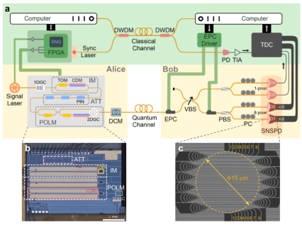 潘建伟、徐飞虎研究组发展了集成光子片上高速高保真度偏振态调制技术,系统重频达到2.5 GHz,量子比特误码率优于0.35%;结合中科院上海微系统所尤立星团队最新研制的八像素SNSPD,实现了高计数率、高效率的单光子探测,在每秒输入5.5亿个光子时仍能保持62%的探测效率;同时,研究组发展了偏振反馈控制、高速后处理模块等。在上述技术突破的基础上,研究团队实现了10公里标准光纤信道下115.8 Mb/s的密钥率,较之前纪录提高了约一个数量级;系统稳定运行超过50个小时,在传输距离328公里下码率超过200b/s。上述研究成果表明,QKD可实现百兆比特率的实时密钥分发,满足高带宽通信需求,对未来量子通信的大规模实际应用具有重要意义。