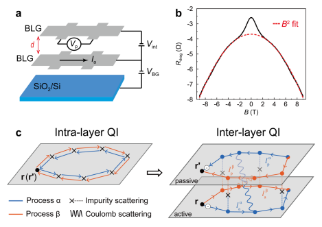 图示:(a)层间拖拽效应测试示意图;(b)电子-电子区间典型拖拽磁电阻;(c)从层内量子干涉到层间多粒子量子干涉。
