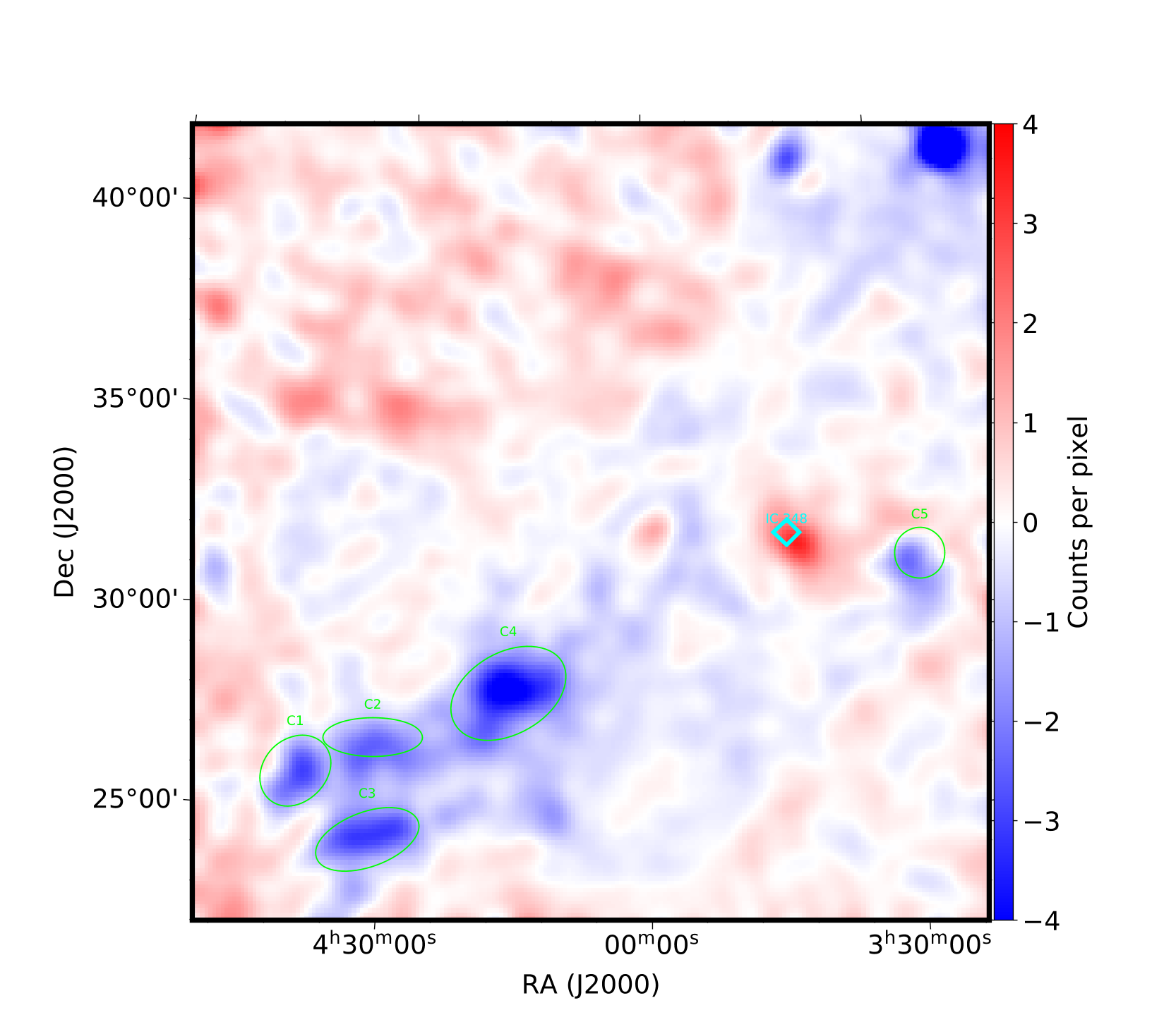 图一: 巨分子云Taurus和Perseus区域以气体柱密度分布图为伽马射线分布模板拟合Fermi-LAT观测数据得到的残余伽马射线分布图,其中致密的团块区域由绿色实线圈出
