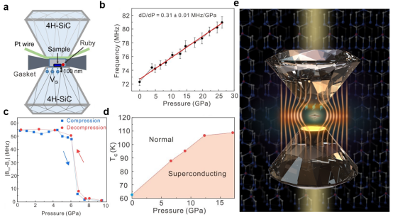 实验结果和示意图。图a碳化硅对顶砧和浅层硅空位色心探测磁性样品示意图;b硅空位色心零场劈裂随压力的变化关系;c钕铁硼材料的磁性相变探测;d钇钡铜氧超导材料的Tc-P相图;e基于碳化硅中硅色心实现高压原位磁探测的示意图。