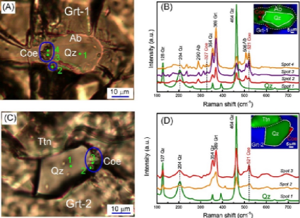 图1. Sesia地体硬玉片麻岩中超高压变质矿物柯石英的拉曼谱图 (Coe,柯石英)