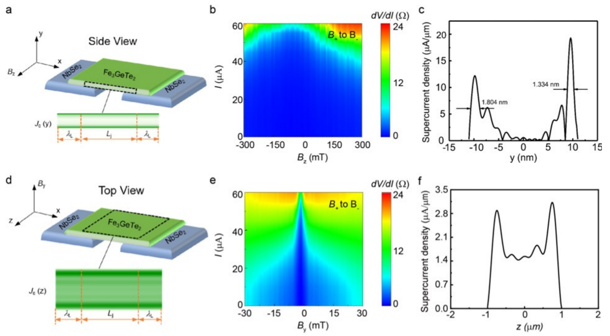 图示:S/F/S约瑟夫森结超电流密度的趋肤效应。(a)磁场沿z轴方向的S/F/S示意图。(b)3 K处通过约瑟夫森结的微分电阻图,显示双缝干涉模式。(c)对(b)中的数据进行反傅里叶变换得到的沿y轴超电流密度的分布。Fe3GeTe2层厚度为22 nm。(d)磁场沿y轴方向的S/F/S结示意图。(e)3 K处通过约瑟夫森结的微分电阻图,显示出混合的单缝和双缝干涉模式。(f)从(e)中数据的反傅里叶变换得到的沿z轴超电流密度的分布,表明超电流可以相对更均匀地沿x轴流过约瑟夫森结,但仍然在表面(现在是两个边缘)达到峰值。通道宽度w为2mm。