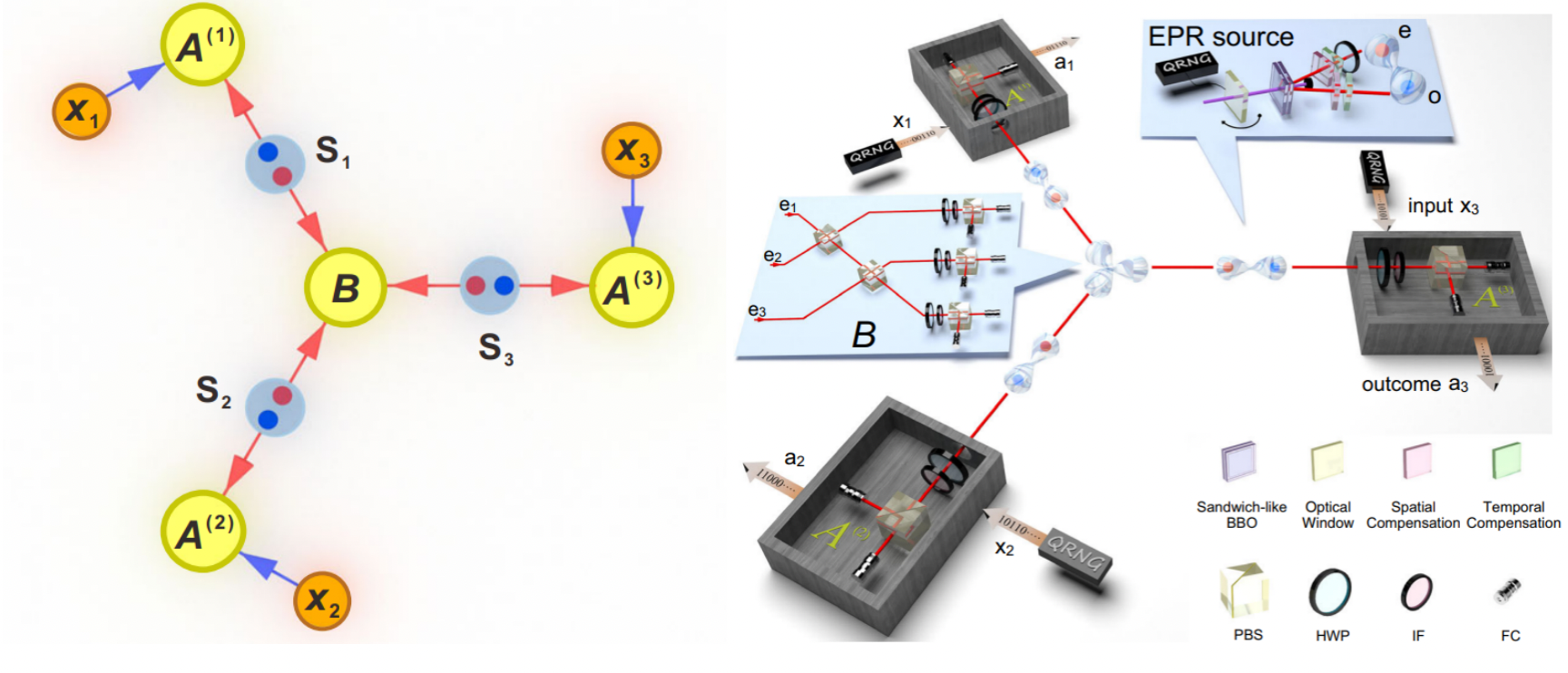 在本工作中,研究组分别在理论与实验上实现突破,成功验证了更复杂的星形网络中的全网络非局域性。理论上,研究组在仅使用独立源(Independence)和无信号(No-signaling)原理而不要求网络遵循量子力学原理的条件下,提出了新的全网络非局域性判据。实验上,研究组利用高品质“三明治”型纠缠光源,搭建了具有三个外围节点的星形网络,并且在中心节点实现了高品质的Greenberger–Horne–Zeilinger态投影测量(如图所示)。实验结果以超过10个标准偏差的水平违背了全网络非局域性判据。这是全网络非局域性在复杂网络中的首次验证,对大规模量子网络的应用,尤其在量子通信协议安全性保证方面具有重要意义。