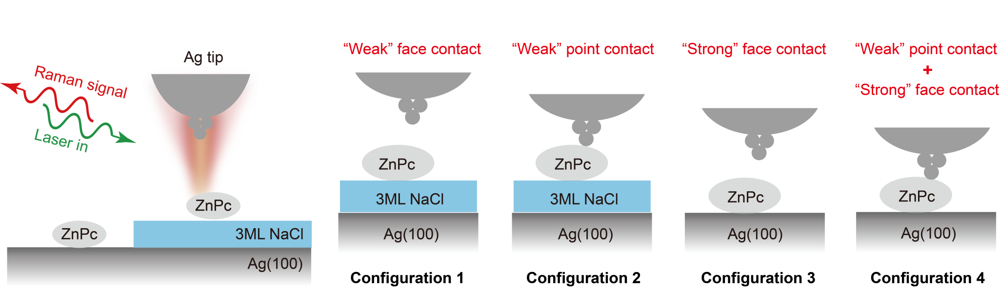 图1.单分子TERS实验示意图和四种不同的分子局域接触环境。