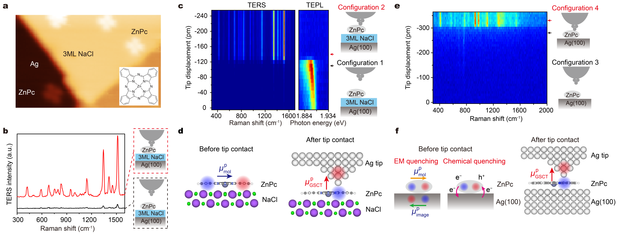 最近,为了深入探究化学效应对拉曼信号的影响机制,该研究小组利用所发展的高分辨TERS技术,通过精心设计和构建四种不同的清晰明确的单分子局域接触环境(图1),探究了单个ZnPc酞菁分子在不同接触环境下的拉曼响应,并结合理论计算揭示了基态电荷转移引起的TERS增强以及界面动态电荷转移诱导的拉曼猝灭的新机制(图2)。