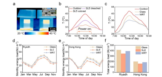 图2. 智能窗户的实际控温性能及节能效率的模拟。a. 安装SLE和WRT智能窗户模型房屋的红外图像,插图为安装SLE和WRT智能窗户模型房屋的实物照片。 b-c. 在实际太阳光照射下,SLE智能窗户和WRT智能窗户的实际控温效果。d.选取利雅得为目标城市,使用普通玻璃窗户、SLE和WRT智能窗户带来的每月能量负荷。e.选取香港为目标城市,使用普通玻璃窗户、SLE和WRT智能窗户带来的每月能量负荷。f. 在利雅得和香港使用普通玻璃窗户、SLE和WRT智能窗户带来的全年总能量负荷。