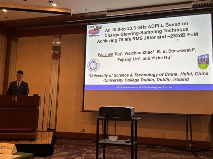 测试结果表明,该芯片实现了75.9fs的时钟抖动与–50.13dBc的参考杂散,并取得了-252.4dB的FoM值,为20GHz以上数字锁相环的最佳水平,芯片核心面积仅为0.044mm2。该研究成果以“An 18.8-to-23.3 GHz ADPLL Based on Charge-Steering-Sampling Technique Achieving 75.9 fs RMS Jitter and -252 dB FoM”为题由博士生陶韦辰在大会作报告。