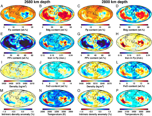 该研究利用计算得到的下地幔主要矿物高温高压弹性数据,结合下地幔三维层析成像模型,采用马尔科夫链蒙特卡洛方法反演得到了整个下地幔的三维矿物成分与温度分布(图1),并进一步得到下地幔三维密度模型。