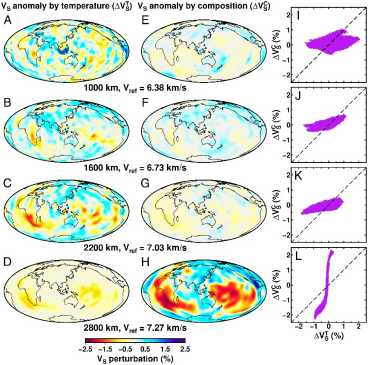 进一步分析发现,下地幔上部的波速异常主要源于热异常,而最底部地幔中的波速异常则主要源于化学成分的变化(图3)。