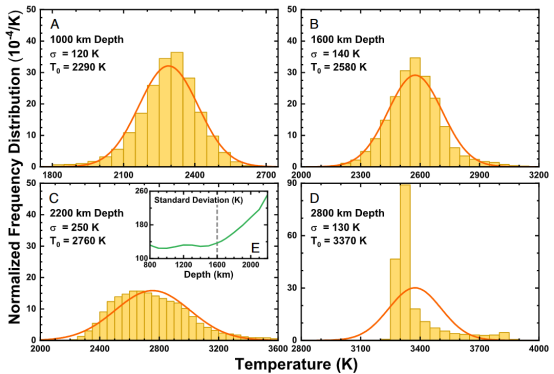 图2.下地幔不同深度处温度的横向频率分布。