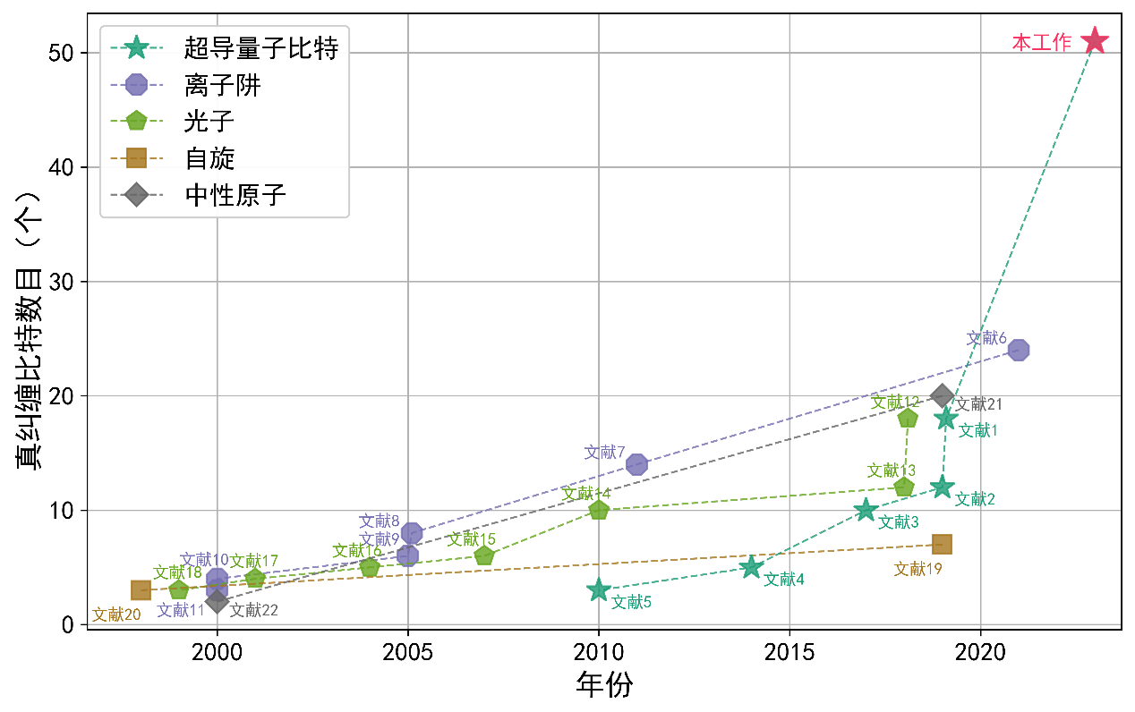 量子纠缠是量子力学中最神秘也是最基础的性质之一,同时也是量子信息处理的核心资源,是量子计算加速效应的根本来源之一。多年以来,实现大规模的多量子比特纠缠一直是各国科学家奋力追求的目标。自1998年人们首次利用核磁共振系统实现3比特GHZ态的制备开始,真多体纠缠态的制备成为包括光子、离子阱、NV色心、中性原子及超导量子比特等各种物理系统规模化扩展的重要表征手段。其中,超导量子比特具有规模化拓展的优势,在近年来发展迅速。我国科学家在超导量子比特多体纠缠制备方面取得了一系列重要成果,自2017年起先后完成了10比特、12比特、18比特的真纠缠态制备,不断刷新超导量子计算领域的纠缠比特数目纪录。