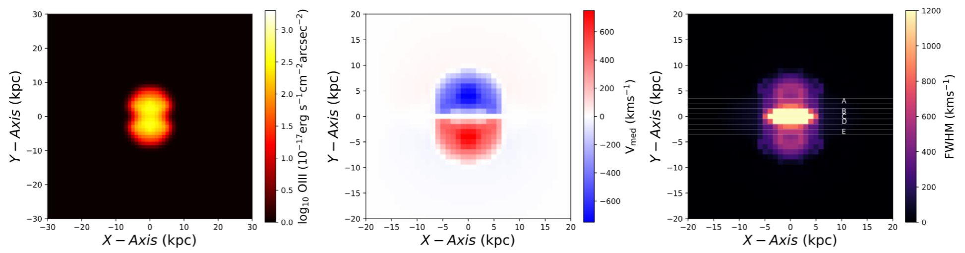 图3.流体力学模拟成功再现了超级气泡对的形态和气体运动学特征。从左到右依次为模拟的表面亮度、视向速度和速度弥散分布图。