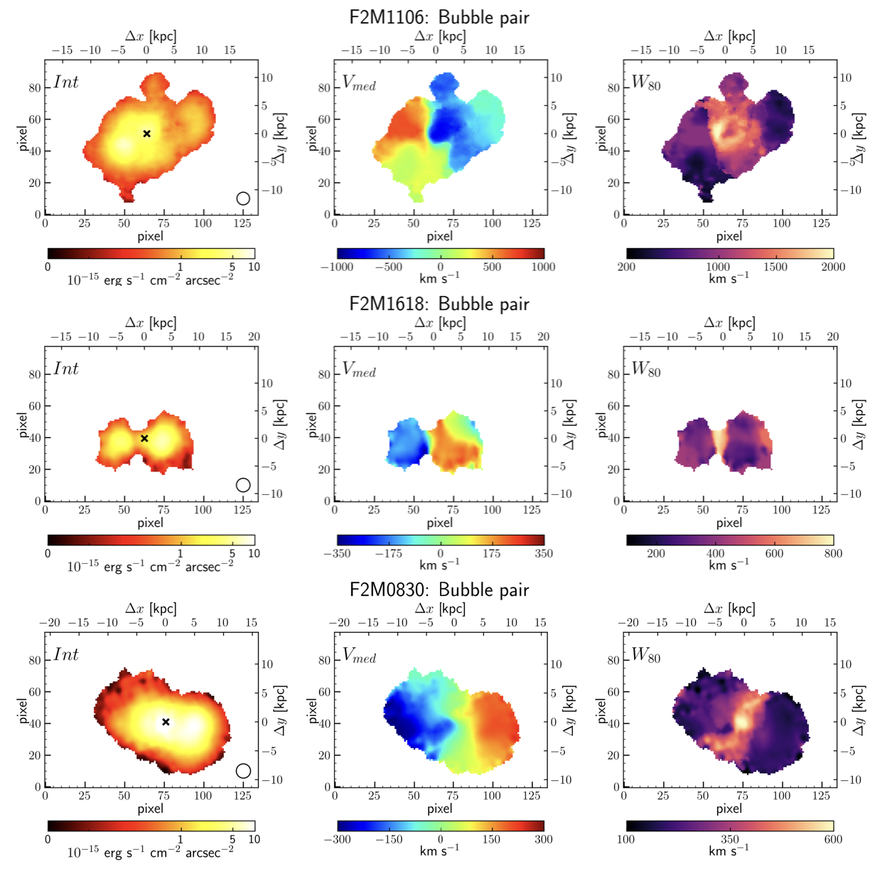 图2.三个红色类星体的超级气泡对,从左至右的三列依次为表面亮度、视向速度和速度弥散的分布图。它们延伸达数万光年,正处于从星系高密度环境中“爆发性逃逸”的短暂阶段,在快速膨胀同时猛然冲向星系外围的空间 。