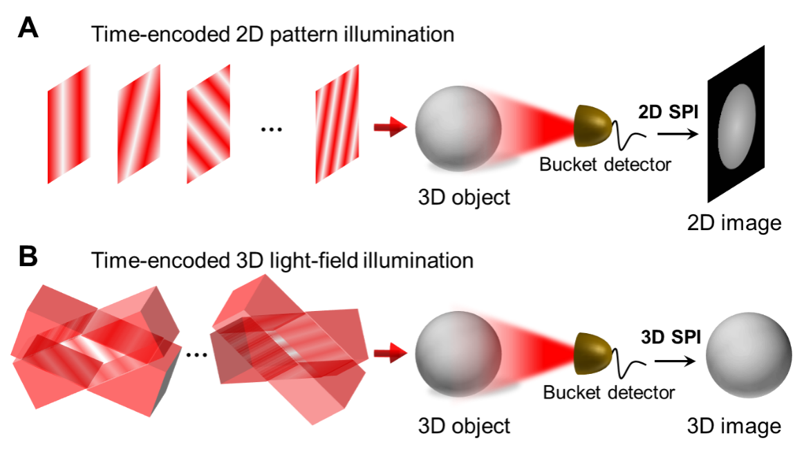 单像素成像是一种新兴的计算成像技术。该技术使用不具备空间分辨能力的单像素探测器来获取目标物体或场景的空间信息。单像素探测器具有高的时间分辨率、光探测效率和探测带宽,因此单像素光学成像技术在散射、弱光等复杂环境下相较于传统面阵成像技术展现了很大优势。更重要的是,近年来随着飞行时间和立体视觉功能的引入,单像素成像能够实现物体场景的3D空间重构,已经应用于生物医学成像、激光雷达、有害气体传感等领域。然而,对于这两种深度信息光学探测方案,目前最先进的三维单像素光学成像技术的深度分辨率只能达到毫米量级,无法实现对微观物体(如生物细胞)的三维高分辨体成像。