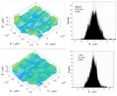 大视场相机是大视场望远镜的核心设备,而由于单片传感器大小的限制,对于大视场相机的焦面没法使用单片传感器来满足大焦面的需求,因此大靶面探测器拼接是大视场相机的研制的关键技术。高精度的焦面拼接首先要求高精度的加工和高精度的测量,由于探测器工作温度往往都是在低温下,以减小探测器的暗电流,因此需要在常温以及低温工况下进行测量,以保证探测器在低温工况下具有良好的平整度,提高探测器的成像质量。