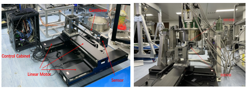 相机研制团队在WFST望远镜副总设计师、中国科学技术大学物理学院核探测与核电子学国家重点实验室王坚教授领导下,进行了主焦相机关键技术的攻关,包括探测器真空低温封装,大靶面探测器高精度测量和拼接,探测器低噪声低功耗读出和驱动,高效相机控制等。对于大靶面探测器高精度测量,研制团队攻克了低温工况下高精度平面度非接触测量的难点,基于激光三角测量法提出了适合于传感器低温封装工况下的差分三角测量方法(Differential Triangulation Measurement),在真空封装下的测量误差不超过0.5%,重复测量精度能达到±2μm。并在此基础上完成DTS测量仪的研制(如图2所示),并最终完成WFST主焦相机低温工况下的测量,如图3所示。目前WFST主焦相机已经完成研制,运往冷湖和望远镜本体进行安装和联调联测。